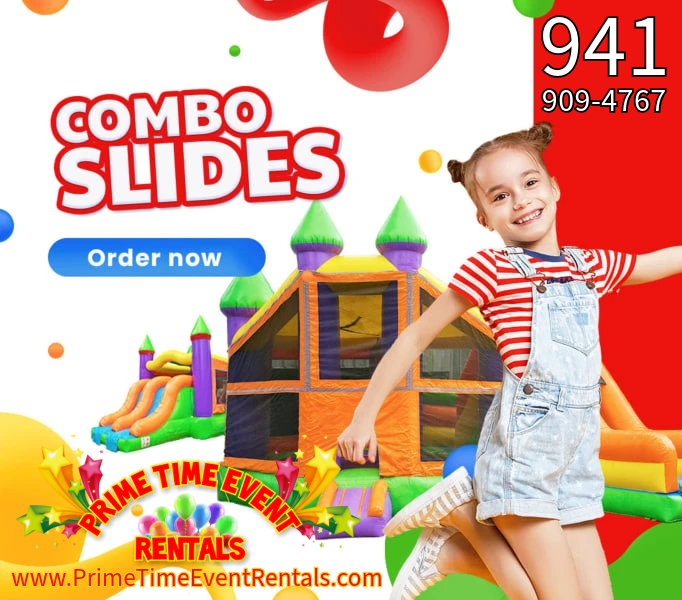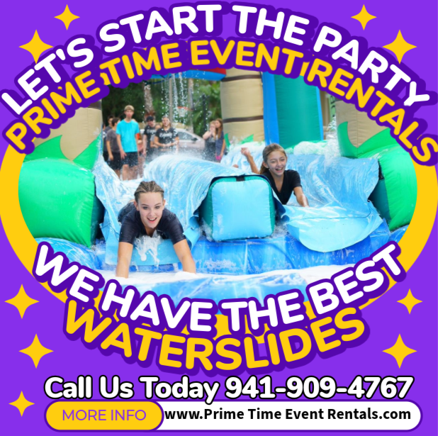Prime Time Event Rentals is your #1 Choice for All your event and party needs with over 20 years experience in the special event business we truly know what it takes to throw an awesome party and event, with all new cutting edge equipment and entertainment No event is to big or to small, we do it all, from Bounce House and Water Slide with some of the best and biggest inflatables in the state of Florida to amazing attraction and mechanical rides like Zip Lines, Rock Wall, Bungee Jumps and Carnivals Rides! Serving The Bay area and its surrounding cities like Sarasota, Bradenton, Brandon, Tampa, Lakewood Ranch, Venice, Parrish, Myakka City, Arcadia, Wachula, Siesta Beach and North Port.